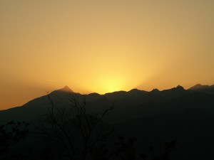 Guardare il tramonto dietro le montagne.